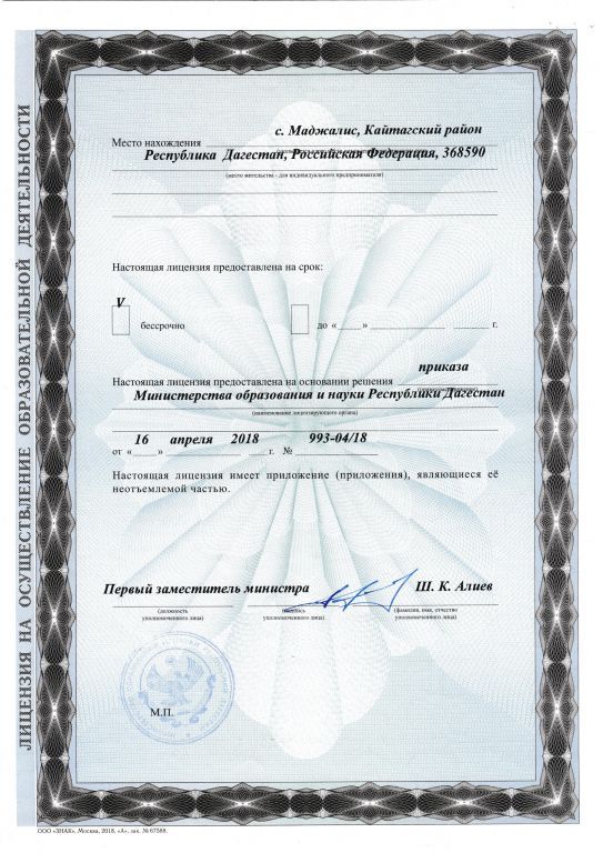 | Адрес местонахождения образовательной организации* | 368590, Республика Дагестан ,Кайтагский район с. Маджалис, ул. Школьная 2ж |